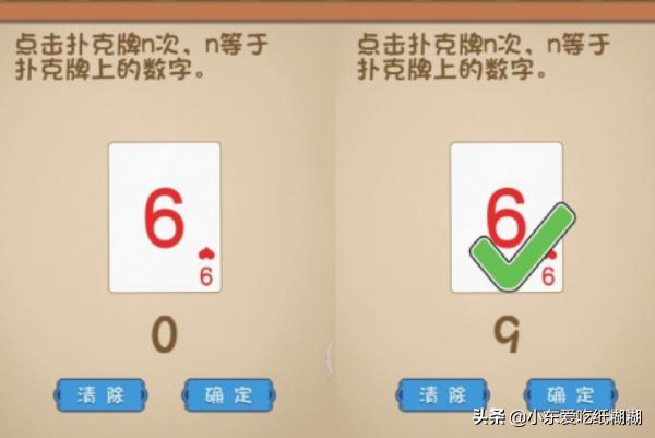 4、第16关 点击扑克牌n次,n等于扑克牌上的数字。这张扑克牌倒了,应该是张9来的,所以要点9次。